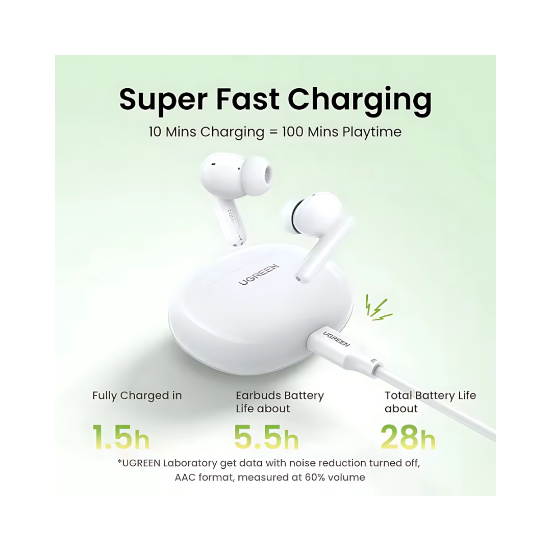 Beyond audio quality, the HiTune P3 earbuds are built for convenience and durability. They feature AI-powered environmental noise cancellation (ENC) on their dual microphones to ensure crystal-clear voice calls by filtering out background noise. The earbuds are equipped with an IPX5 water resistance rating, making them resistant to sweat and light rain, and a great companion for workouts or outdoor activities. With Bluetooth 5.4, they provide a stable and fast connection, and with the UGREEN app, you can even connect them to two devices simultaneously, allowing for seamless switching. The earbuds offer up to 5.5 hours of playback on a single charge, and the included USB-C charging case extends the total listening time to a generous 28 hours, with a fast-charging feature that provides 100 minutes of playtime after just a 10-minute charge.